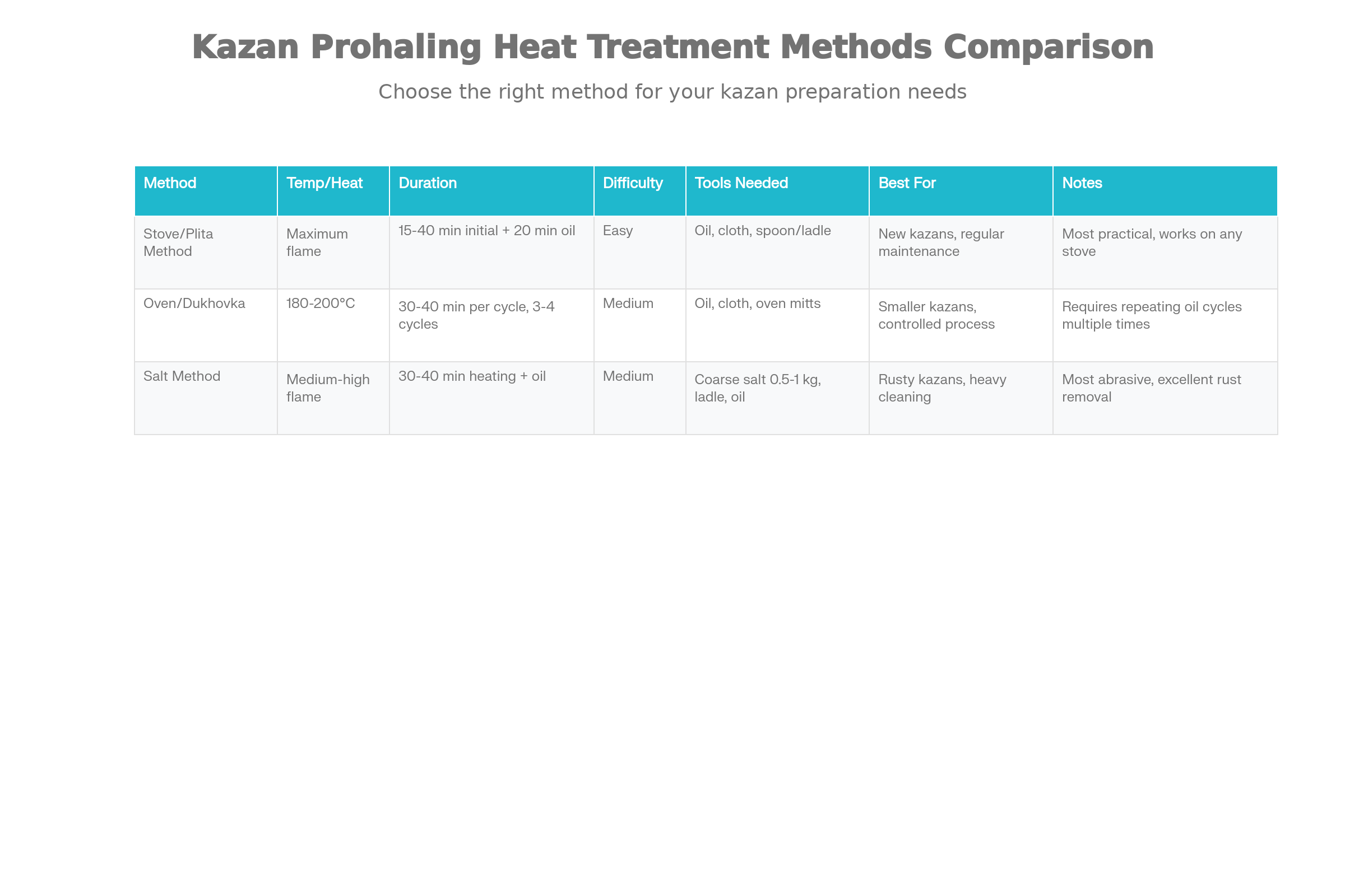 Новый казан из магазина или с рынка обязательно прокаливают перед использованием. Это объясняется тем, что при литье и хранении казаны смазываются техническим (индустриальным) маслом для защиты от коррозии. Это масло нельзя использовать для готовки — оно может быть токсичным.